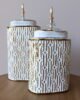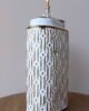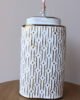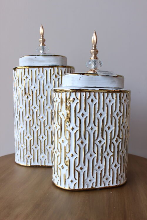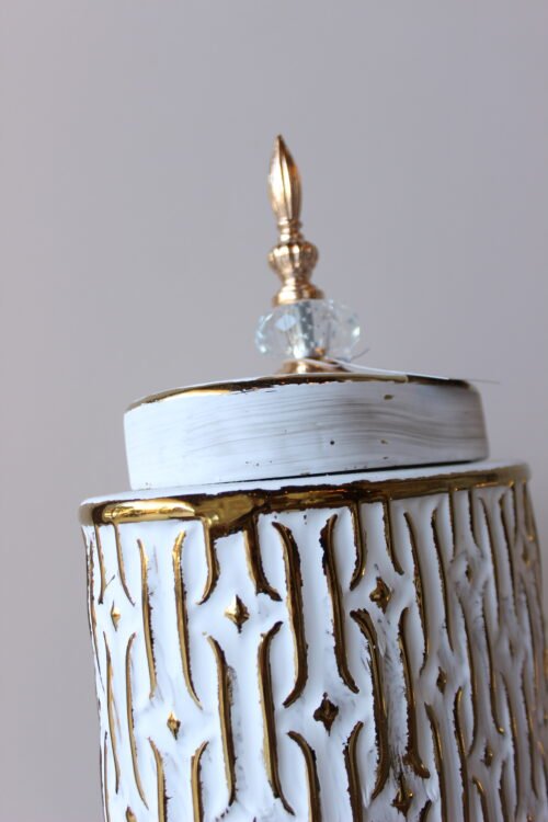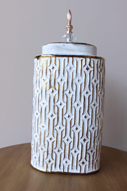 Anfora decorativa elaborado en cerámica blanca con acabado esmaltado, realzado con relieves verticales y detalles en tono dorado que aportan sofisticación y textura. Incluye tapa con acento metálico y detalle superior tipo cristal, convirtiéndolo en una pieza decorativa refinada y atemporal. Ideal para consolas, mesas auxiliares o repisas.