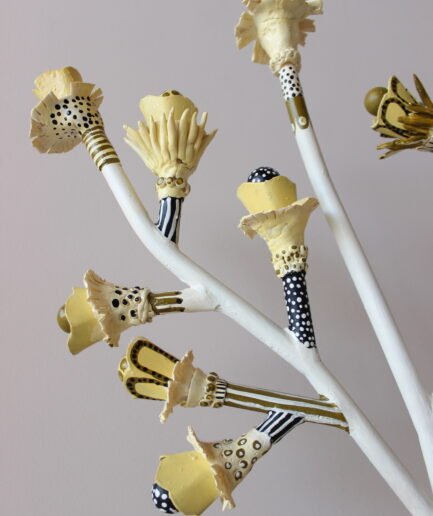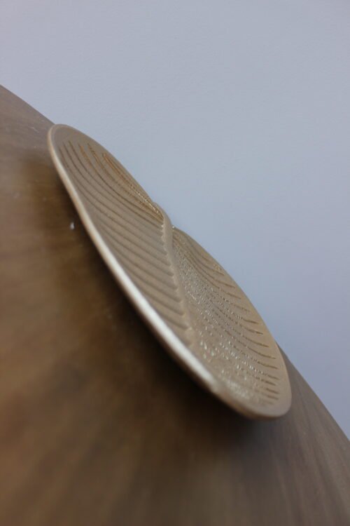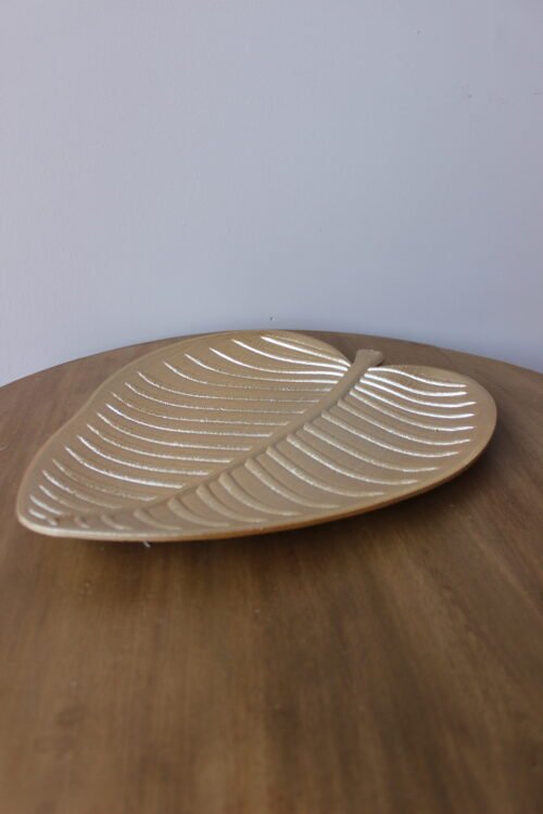 Bandeja decorativa elaborada en madera con acabado dorado, de diseño orgánico inspirado en la forma de una hoja. Presenta relieves lineales que aportan textura y reflejos sutiles, creando una pieza elegante y atemporal. Ideal para mesas de centro, consolas o como base para composiciones decorativas.