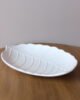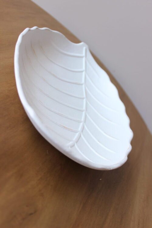 Bandeja decorativa elaborada en cerámica blanca con acabado mate, de diseño orgánico inspirado en la forma de una hoja. Sus relieves suaves y bordes delicados aportan textura y un aire natural, convirtiéndola en una pieza versátil y atemporal. Ideal para mesas de centro, consolas o como base para composiciones decorativas.