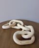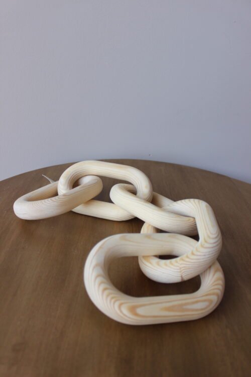 Escultura decorativa elaborada en madera natural, de diseño orgánico entrelazado con formas curvas que generan movimiento y fluidez visual. Su acabado suave y vetas visibles resaltan la belleza del material, convirtiéndola en una pieza contemporánea y atemporal. Ideal para mesas de centro, consolas o repisas como acento escultórico.