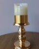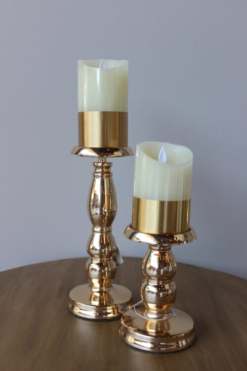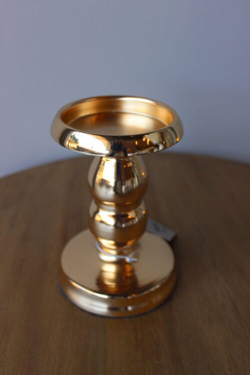 Candelabro decorativo elaborado en metal con acabado dorado brillante, de silueta clásica y base sólida que aporta estabilidad y presencia. Su diseño estilizado y atemporal refleja la luz con sutileza, convirtiéndolo en una pieza ideal para crear ambientes cálidos y sofisticados. Perfecto para mesas de comedor, consolas o centros de mesa, ya sea solo o combinado en pares o alturas diferentes.