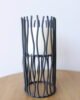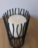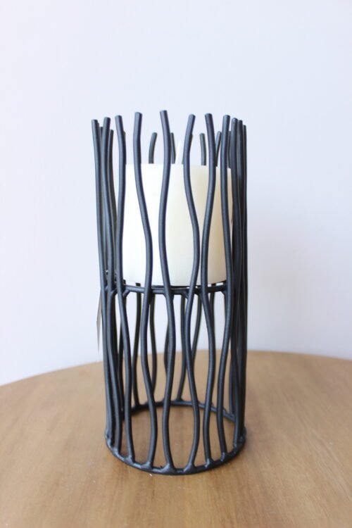 Portavela decorativo con estructura metálica en acabado negro, de diseño vertical con varillas orgánicas que aportan textura y movimiento visual. En su interior integra un cilindro para vela que permite una iluminación suave y controlada, creando una atmósfera cálida y contemporánea. Ideal para mesas, consolas o rincones especiales del hogar.