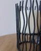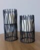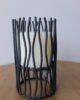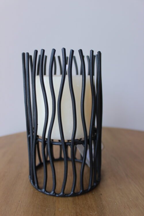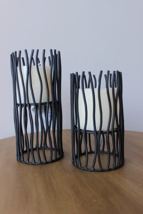 Portavela decorativo con estructura metálica en acabado negro, de diseño vertical con varillas orgánicas que aportan textura y movimiento visual. En su interior integra un cilindro para vela que permite una iluminación suave y controlada, creando una atmósfera cálida y contemporánea. Ideal para mesas, consolas o rincones especiales del hogar.