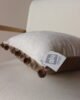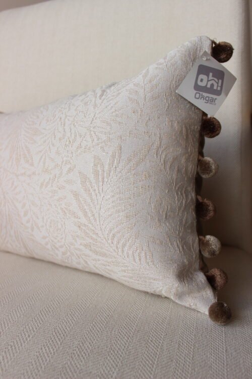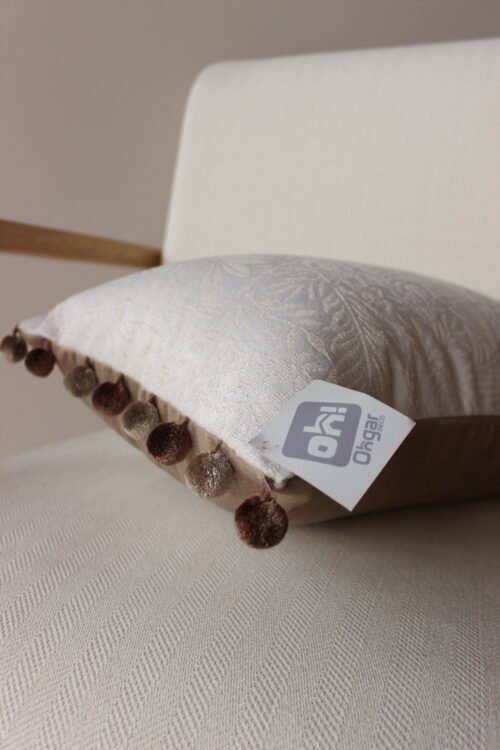 Funda cojín decorativo con estampado delicado de inspiración natural que aporta textura y luminosidad al espacio. Los pompones laterales añaden un detalle artesanal y acogedor, mientras que su paleta de tonos neutros lo convierte en una pieza versátil y atemporal para salas y alcobas.