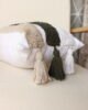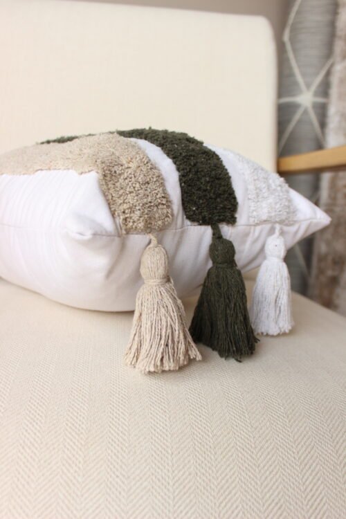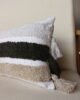 Funda de Cojín decorativo con franjas en diferentes texturas y alturas que aportan profundidad y carácter al espacio. Su combinación de tonos neutros y terrosos, junto con los flecos laterales, crea una pieza cálida y versátil, ideal para salas y alcobas con estilo natural y acogedor.