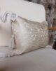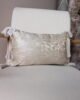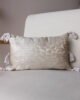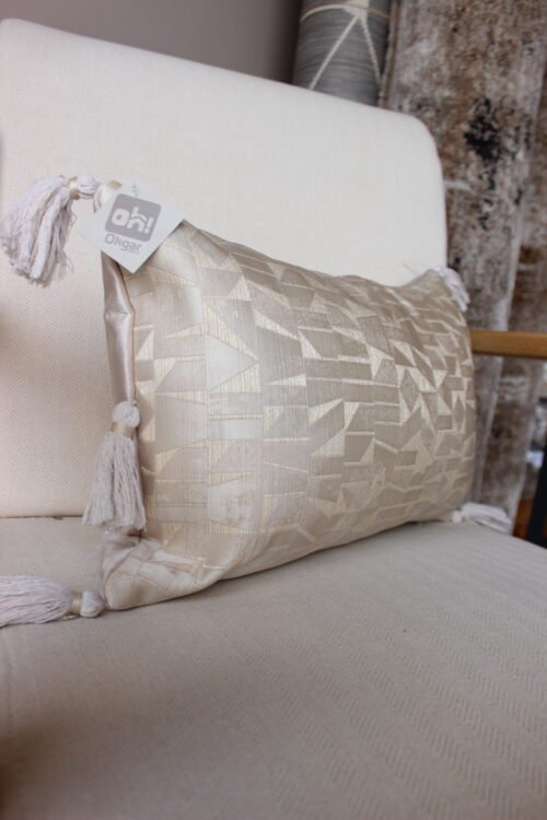 Funda de cojín decorativo con diseño geométrico sutil en tonos neutros que aporta textura y luminosidad al espacio. Los flecos en las esquinas añaden un detalle artesanal que equilibra elegancia y calidez, convirtiéndolo en una pieza versátil y atemporal para salas, alcobas y espacios acogedores.