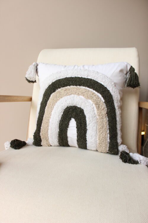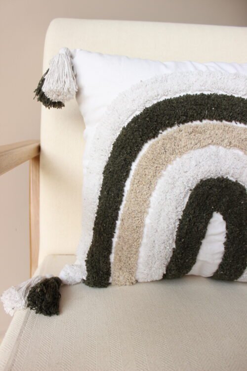 Funda de Cojín decorativo con diseño de arco en relieve y texturas suaves que aportan calidez y carácter al espacio. Su combinación de tonos neutros y naturales, junto con los flecos laterales, lo convierte en una pieza acogedora y atemporal, ideal para salas y alcobas con estilo orgánico y contemporáneo.