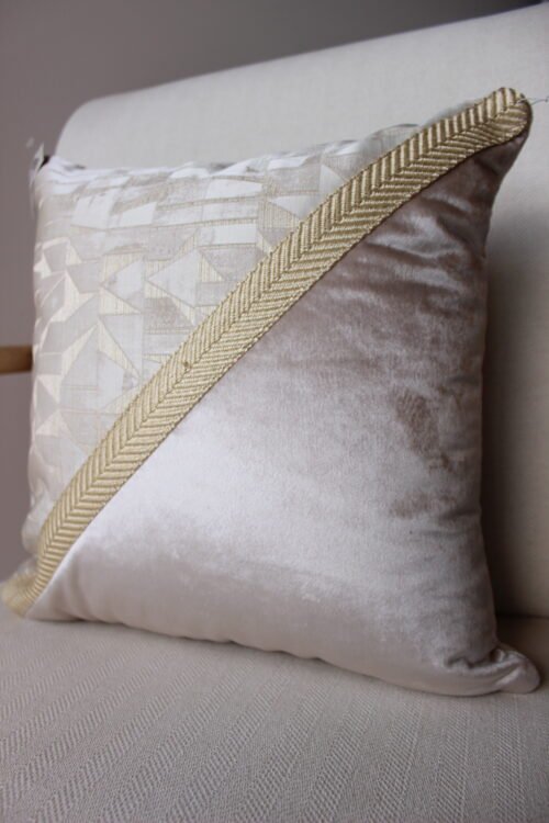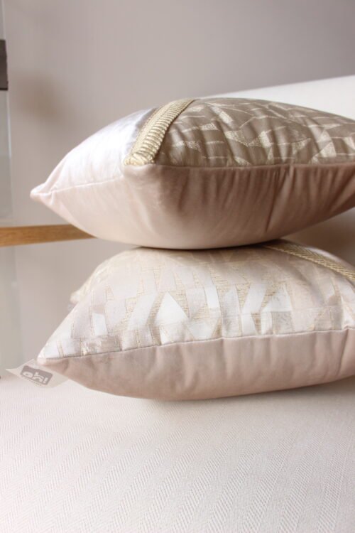 Cojín decorativo que combina un diseño geométrico sutil con telas de acabado suave, creando una pieza sofisticada y acogedora. El detalle diagonal en textura aporta contraste y profundidad, mientras que su paleta de tonos neutros lo hace ideal para espacios elegantes, modernos y atemporales.