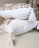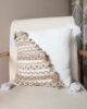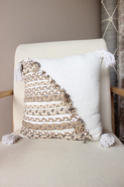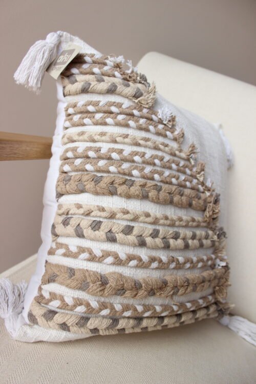 Funda de cojín decorativo con combinación de tejidos y detalles en relieve que aportan calidez y un estilo natural al espacio. Su diseño en tonos neutros y flecos en las esquinas lo hace ideal para ambientes acogedores, boho y atemporales.