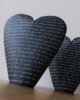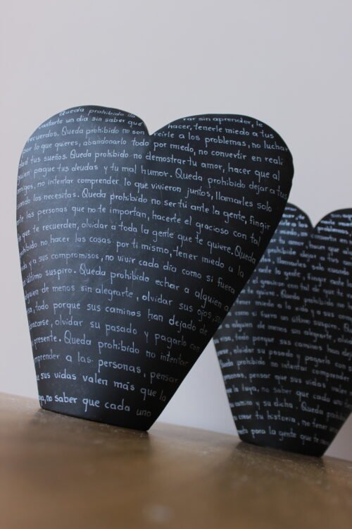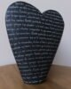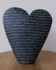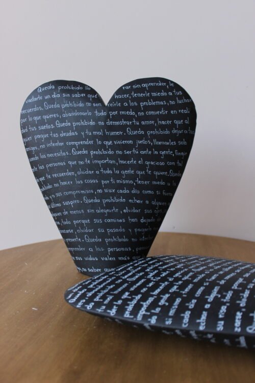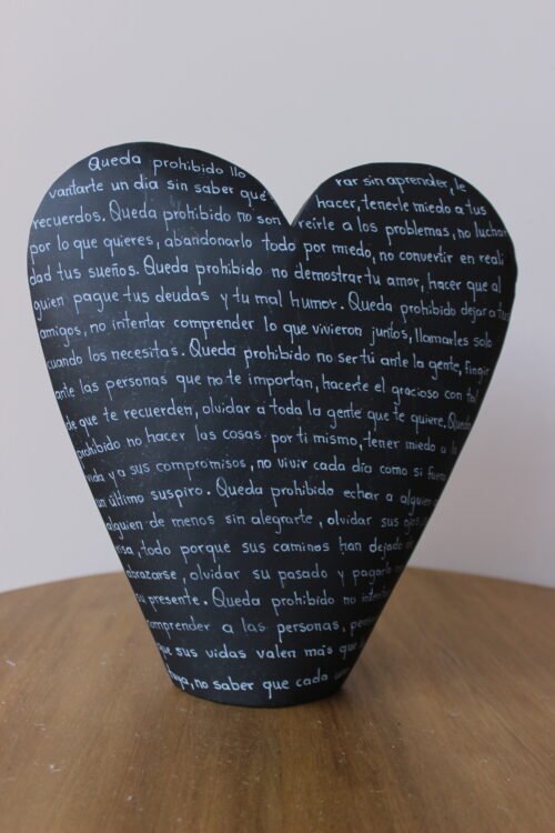 Objeto decorativo elaborado en cerámica en tono negro mate, con silueta orgánica en forma de corazón y texto caligráfico en contraste claro que recorre toda la pieza. Su diseño poético y expresivo la convierte en un elemento cargado de significado, ideal para aportar un mensaje y un punto focal emocional a cualquier espacio. Perfecto para mesas, consolas o repisas.