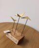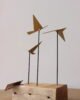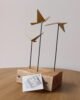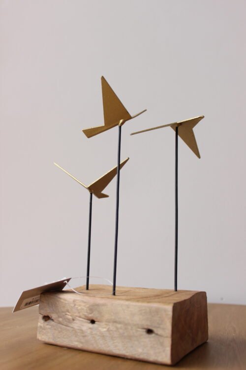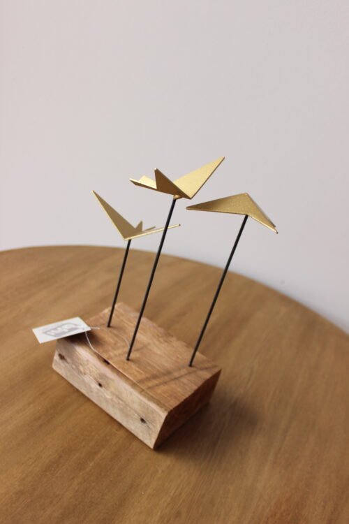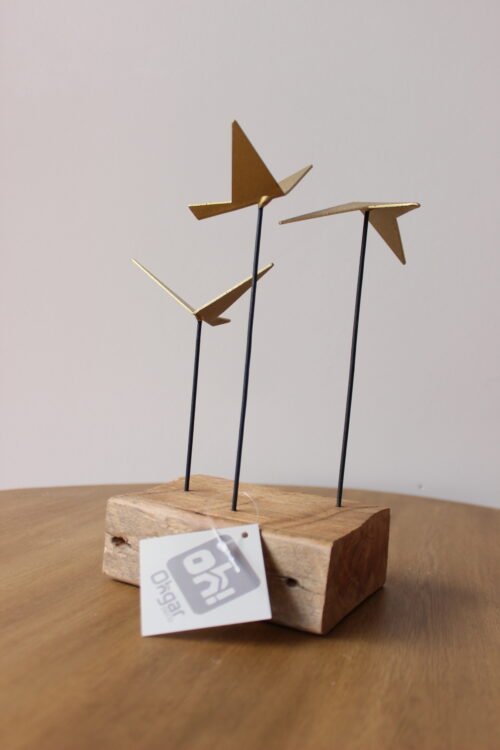 Escultura decorativa elaborada en metal con acabado dorado, compuesta por aves geométricas estilizadas montadas sobre varillas metálicas negras y base de madera natural. Su diseño escultórico combina líneas modernas con materiales cálidos, creando una pieza contemporánea con carácter. Ideal para mesas de centro, consolas o repisas como punto focal decorativo.