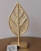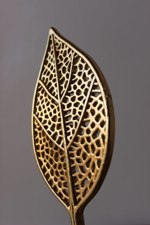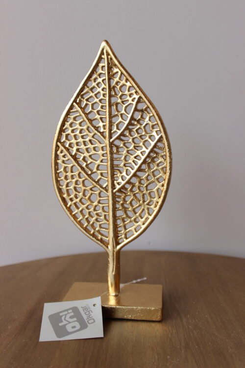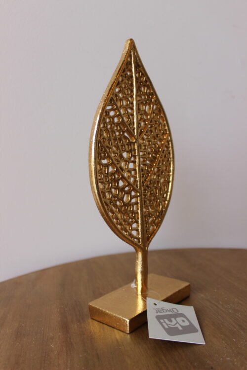 Escultura decorativa elaborada en cerámica dorada, con diseño calado en forma de hoja que resalta sus vetas y detalles naturales. Una pieza sofisticada y liviana visualmente, perfecta para consolas, mesas auxiliares o repisas que buscan un acento sutil pero protagonista.