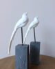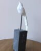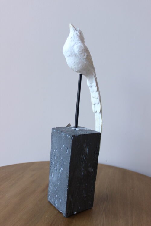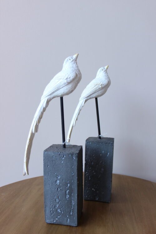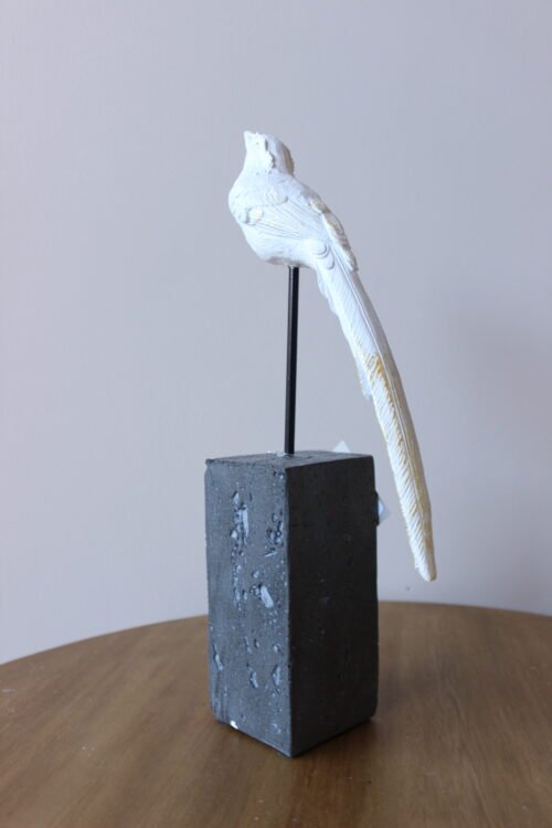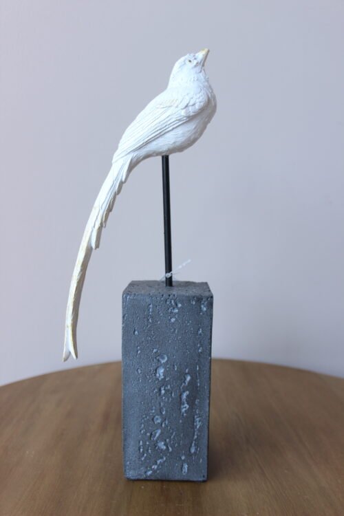 Escultura decorativa de ave elaborada en resina con acabado blanco, montada sobre una base geométrica y soporte metálico. Su silueta estilizada y detalles en relieve aportan ligereza y sofisticación, creando una pieza artística de carácter contemporáneo. Ideal para consolas, mesas auxiliares o repisas como acento decorativo.