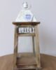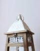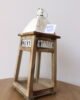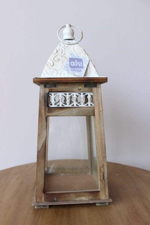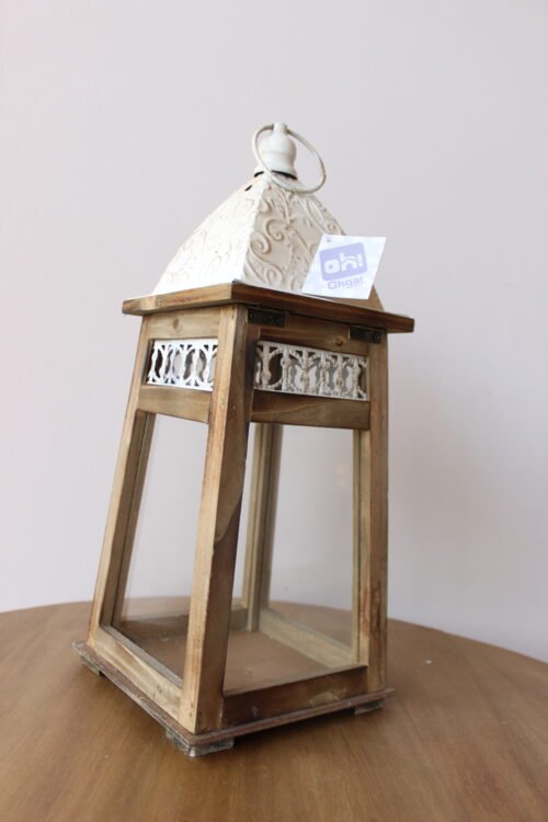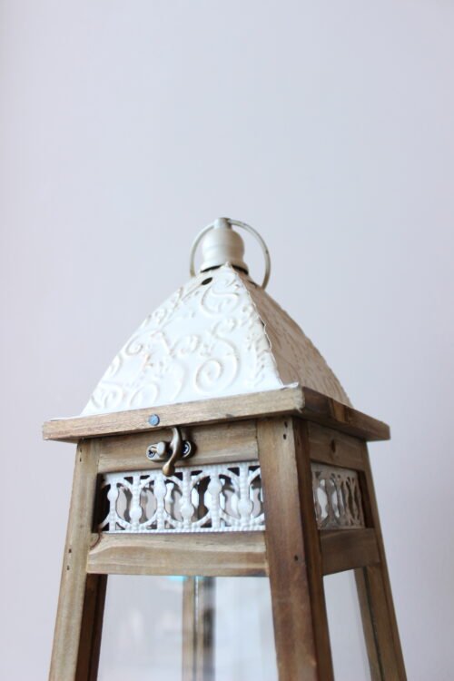 Farol decorativo con estructura en madera, paneles de vidrio y techo metálico en acabado blanco con detalles en relieve. Su diseño clásico y acogedor es ideal para crear ambientes cálidos y elegantes en interiores o exteriores cubiertos, perfecto para velas y luz ambiental.
