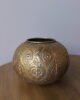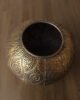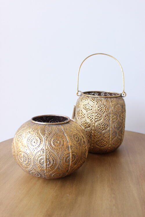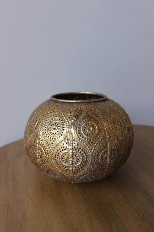 Portavelas decorativo elaborado en metal con acabado dorado envejecido, de forma orgánica y diseño perforado con patrones circulares en relieve. Su estructura permite que la luz se filtre suavemente, creando un efecto cálido y envolvente que aporta atmósfera y sofisticación al espacio. Ideal para mesas, consolas o centros decorativos.