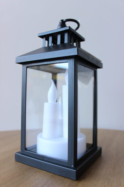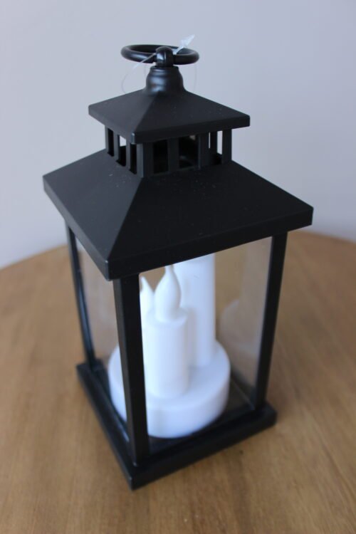 Farol decorativo elaborado en pasta con acabado negro mate y paneles de vidrio transparente, de diseño clásico y líneas limpias. Incluye velas LED que aportan una iluminación cálida y segura, ideal para crear atmósferas acogedoras. Perfecto para mesas auxiliares, repisas, entradas o para ambientar espacios interiores y exteriores cubiertos con un toque atemporal y sofisticado.
