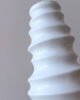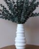 Jarrón decorativo elaborado en cerámica blanca con acabado brillante, de diseño vertical con relieves ondulados que aportan movimiento y textura visual. Su silueta contemporánea y líneas suaves lo convierten en una pieza versátil y atemporal. Ideal para mesas, consolas o repisas, solo o como parte de una composición decorativa.