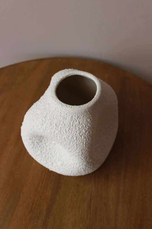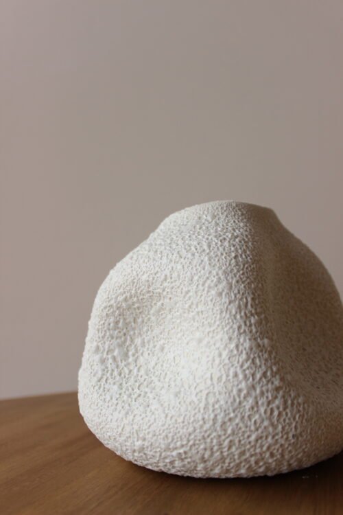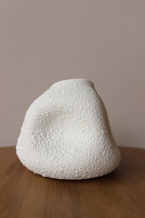 Objeto decorativo elaborado en cerámica blanca con acabado texturizado, de forma orgánica inspirada en elementos naturales. Su superficie irregular aporta profundidad visual y una sensación artesanal, convirtiéndolo en una pieza escultórica sutil y atemporal. Ideal para mesas de centro, repisas o composiciones decorativas.