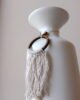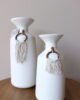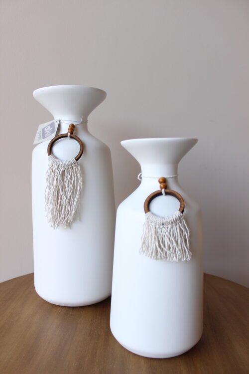 Jarrón decorativo en cerámica blanca de acabado mate, con líneas suaves y forma orgánica. Su detalle artesanal en aro de madera y fibras naturales añade calidez y textura, creando un equilibrio perfecto entre minimalismo y estilo boho sofisticado. Perfecto para realzar mesas, repisas o recibidores.