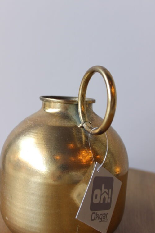 Jarrón decorativo elaborado en metal con acabado dorado, de diseño orgánico y asa lateral que le aporta carácter y estilo. Ideal para mesas auxiliares, consolas o repisas, ya sea solo o como complemento decorativo.