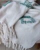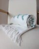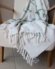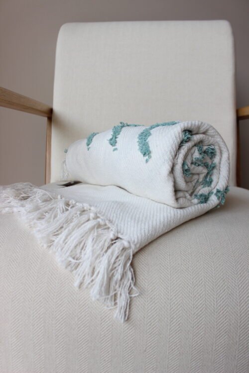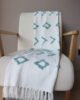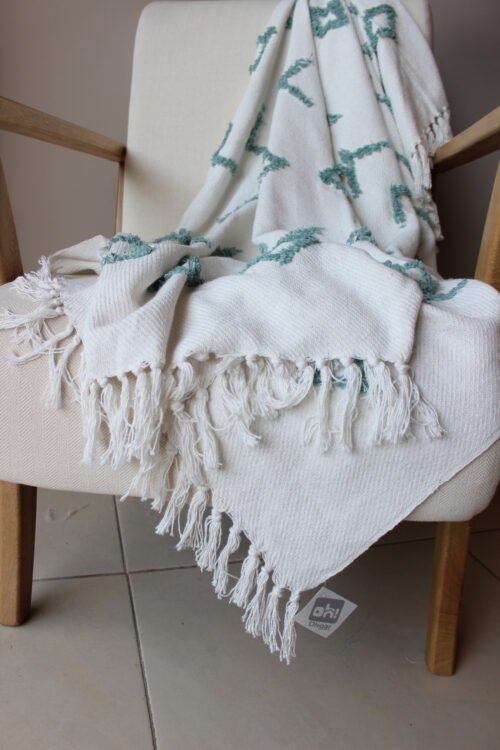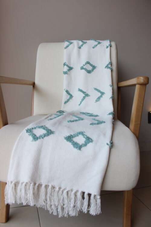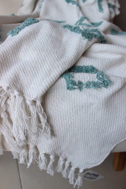 Frazada decorativa elaborada en algodón de textura ligera, en tono blanco con detalles geométricos bordados en verde agua que aportan frescura y un aire artesanal al espacio. Su diseño combina patrones sutiles con una textura delicada que añade interés visual sin recargar. Los flecos en los extremos completan su estética acogedora y natural. Ideal para sofás, poltronas o al pie de la cama, perfecta para ambientes serenos, estilos boho suaves