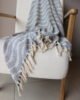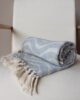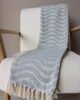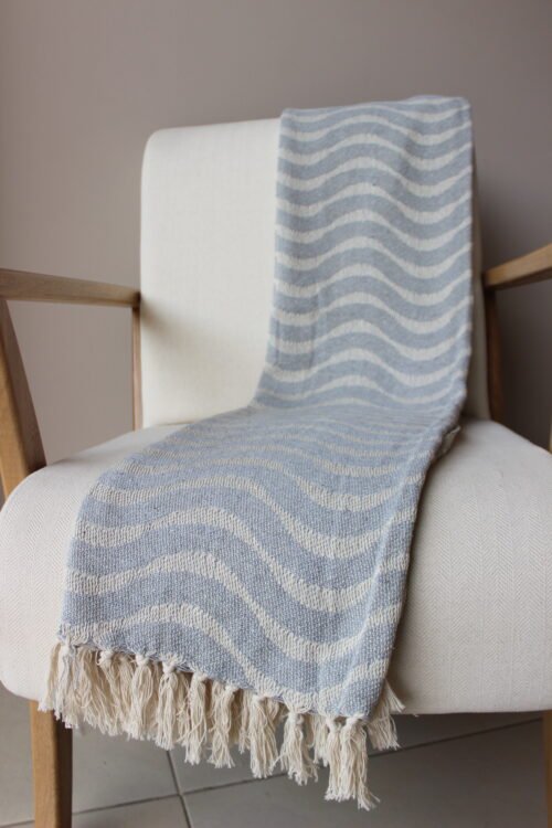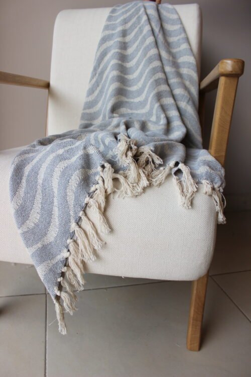 Frazada decorativa elaborada en algodón de textura ligera, en una combinación de tonos azul suave y blanco con patrón ondulado que evoca calma y fluidez. Su diseño aporta movimiento visual sin recargar el espacio, mientras que los flecos artesanales en los extremos añaden un acabado acogedor y natural. Ideal para sofás, poltronas o al pie de la cama, perfecta para ambientes relajados, estilos costeros, naturales