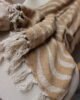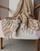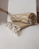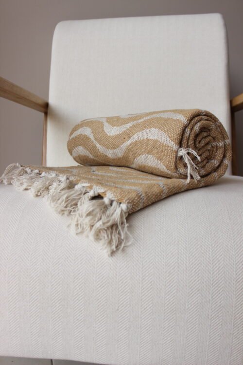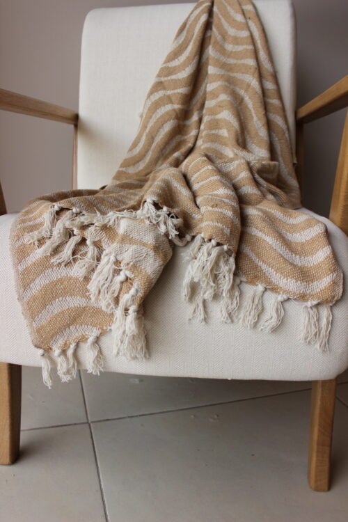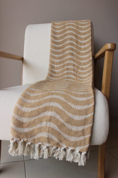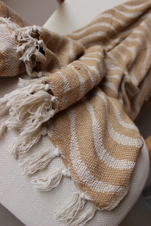 Frazada decorativa elaborada en algodón de textura suave y envolvente, en un tono caramelo con diseño ondulado en contraste crudo que aporta movimiento y calidez visual. Su patrón orgánico evoca elementos naturales y se complementa con flecos artesanales en los extremos, creando una pieza acogedora y con personalidad. Ideal para sofás, poltronas o al pie de la cama, perfecta para espacios cálidos, estilos boho elegantes o ambientes de inspiración natural.