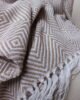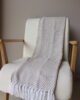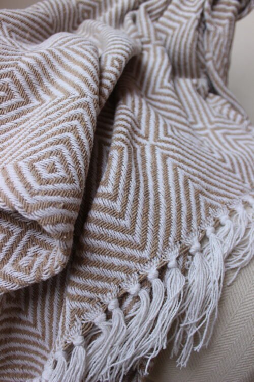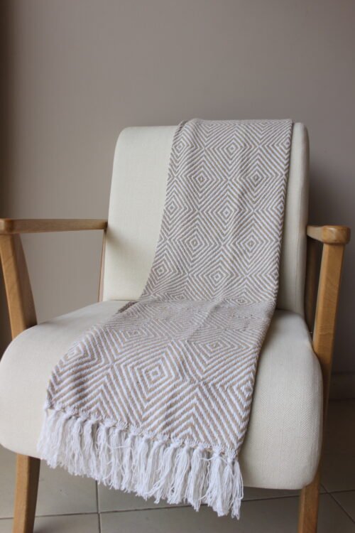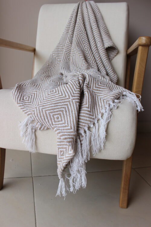 Frazada decorativa elaborada en algodón de textura ligera, en una combinación de tonos beige y blanco con patrón geométrico en relieve que aporta elegancia y profundidad visual. Su diseño atemporal se complementa con flecos delicados en los extremos, creando un acabado artesanal y acogedor. Ideal para sofás, poltronas o al pie de la cama, perfecta para espacios luminosos, estilos naturales