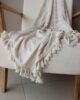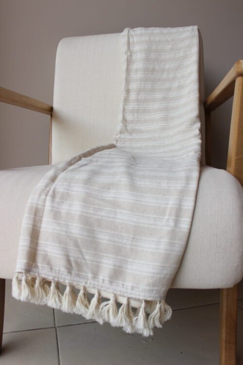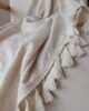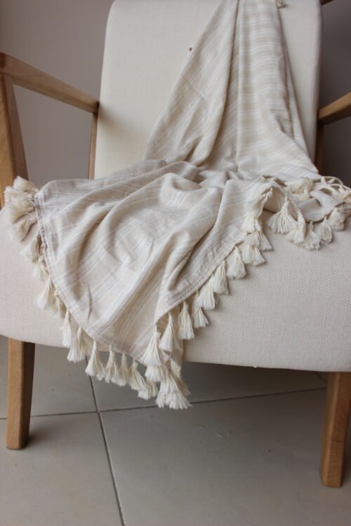 Frazada decorativa elaborada en lino y rayón de textura ligera y fluida, en un tono crudo con delicadas líneas tejidas que aportan sutileza y movimiento. Su diseño se realza con borlas artesanales en los extremos, creando una pieza acogedora y elegante. Ideal para sofás, poltronas o al pie de la cama, perfecta para espacios serenos, estilos naturales, boho suaves