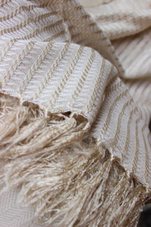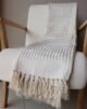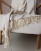 Frazada decorativa elaborada en tejido de polipropileno con acabado artesanal, en un tono marfil suave que aporta calidez y sofisticación al espacio. Su diseño presenta un delicado patrón en relieve tipo espiga, acompañado de flecos largos y desflecados que aportan movimiento y carácter. Ideal para sofás, poltronas o al pie de la cama, perfecta para ambientes naturales, boho elegantes o espacios tipo hotel boutique que buscan textura y personalidad.