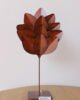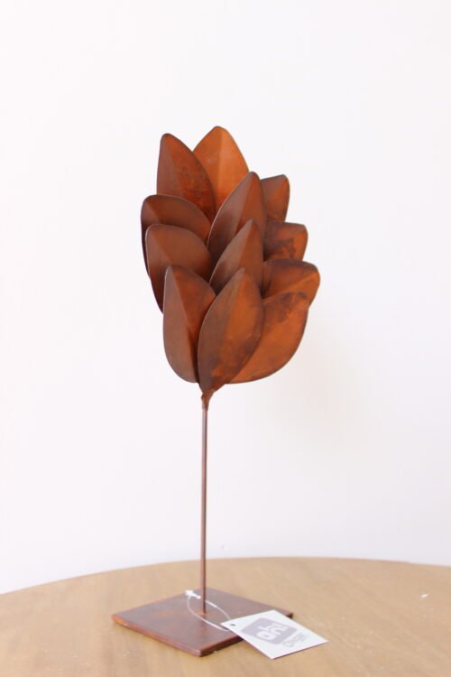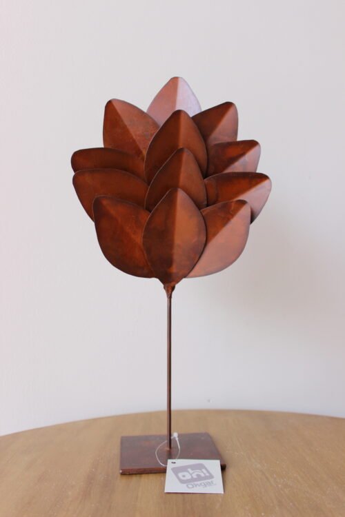 Escultura decorativa elaborada en metal con acabado tipo óxido, inspirada en formas naturales. Su diseño floral y base metálica la convierten en una pieza protagonista, perfecta para mesas, consolas o repisas que buscan un acento artístico y sofisticado.