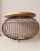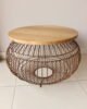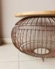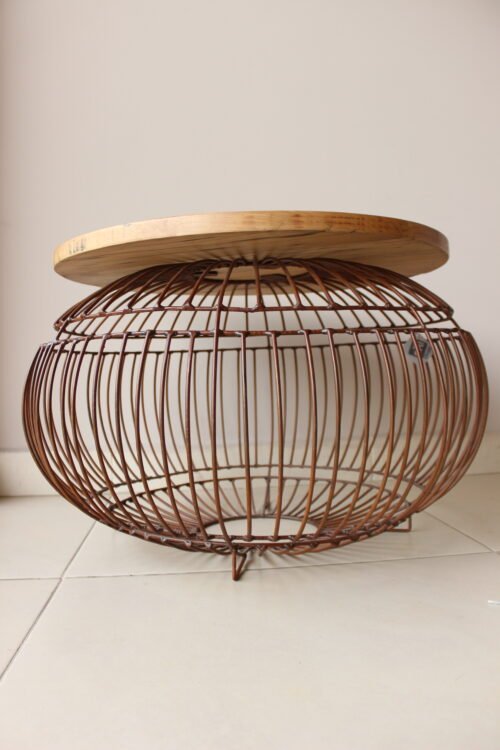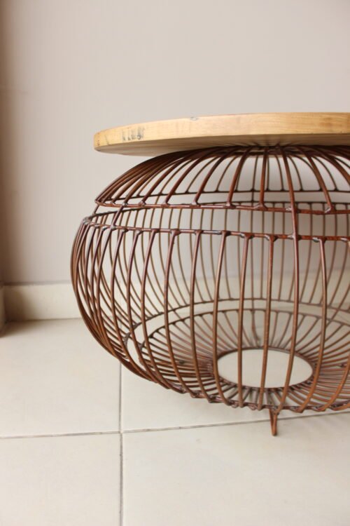 Mesa auxiliar elaborada con tapa circular en madera natural de acabado cálido, sostenida sobre una estructura metálica tipo canasta en tono cobre envejecido. Su diseño escultórico combina ligereza visual y carácter artesanal, convirtiéndola en una pieza protagonista del espacio. Ideal para salas, terrazas cubiertas o rincones especiales, perfecta para estilos contemporáneos, boho sofisticados o ambientes naturales con acentos decorativos.