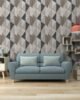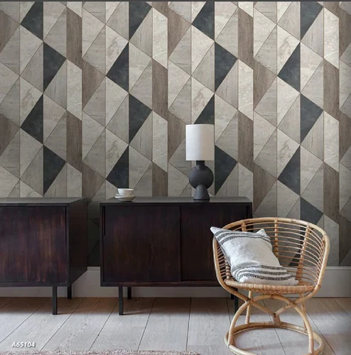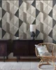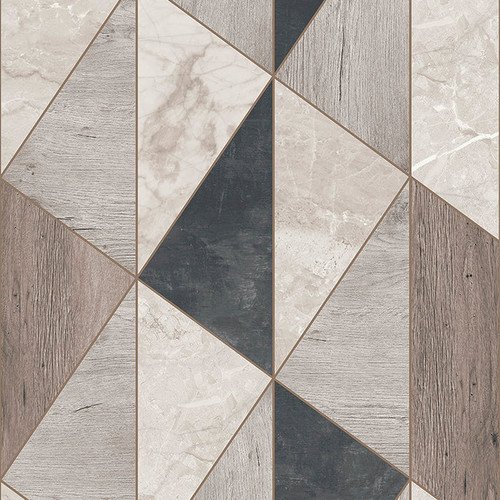 Papel de colgadura decorativo con diseño geométrico contemporáneo, compuesto por triángulos y planos angulares que combinan texturas tipo mármol, piedra y madera. Su paleta neutra en tonos beige, arena, gris y grafito, con finos acentos lineales, aporta profundidad visual y un aire arquitectónico sofisticado. Ideal para muros protagonistas en salas, comedores, estudios u oficinas, creando espacios modernos, equilibrados y con carácter atemporal.