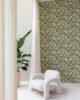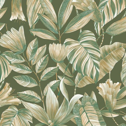 Papel de colgadura decorativo con diseño botánico de hojas y flores estilizadas, en una paleta de verdes profundos, marfil y acentos beige sobre fondo verde oliva. Sus trazos orgánicos y texturas sutiles crean un efecto visual envolvente que aporta frescura, profundidad y sofisticación al espacio. Ideal para muros protagonistas en salas, comedores o habitaciones, perfecto para quienes buscan un estilo natural, elegante y con personalidad.