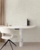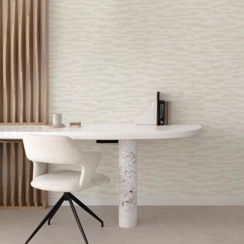 Papel de colgadura decorativo con diseño geométrico sutil en disposición horizontal, en tonos marfil y beige claro con acabado mate texturizado. Su patrón delicado aporta profundidad visual y movimiento sin recargar el espacio, convirtiéndose en una base neutra sofisticada. Ideal para salas, estudios u oficinas, perfecto para ambientes contemporáneos, minimalistas o de inspiración natural.