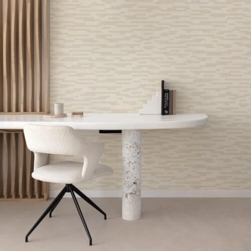 Papel de colgadura decorativo con diseño geométrico sutil en disposición horizontal, en tonos beige claros y beige orcuros con acabado mate texturizado. Su patrón delicado aporta profundidad visual y movimiento sin recargar el espacio, convirtiéndose en una base neutra sofisticada. Ideal para salas, estudios u oficinas, perfecto para ambientes contemporáneos, minimalistas o de inspiración natural.