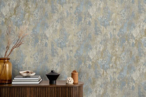 Papel de colgadura decorativo con un potente efecto mural tipo estuco artístico, inspirado en superficies envejecidas con carácter pictórico. Su combinación de tonos beige, arena, azul suave y sutiles matices grisáceos crea una textura rica y expresiva que aporta profundidad y personalidad al espacio sin perder elegancia. Ideal para muros protagonistas en salas, comedores, estudios o proyectos residenciales y hoteleros que buscan un estilo contemporáneo, orgánico y con alma artesanal.