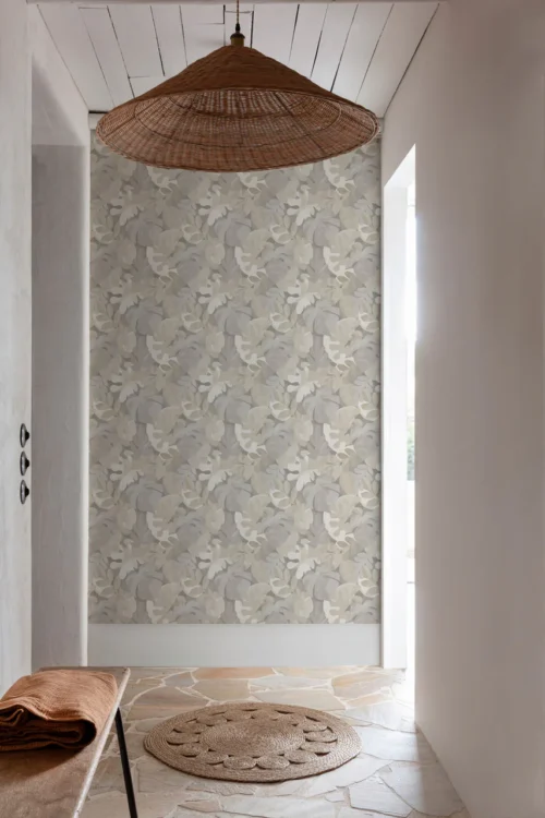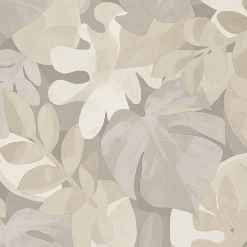 Papel de colgadura decorativo con diseño botánico abstracto de hojas orgánicas superpuestas, en una armonía de tonos marfil, beige, arena y gris cálido. Su composición fluida y delicada crea un efecto envolvente y sereno que aporta profundidad visual sin saturar el espacio. Ideal para salas, habitaciones o estudios donde se busque un ambiente natural, sofisticado y contemporáneo, con una estética artística y atemporal.