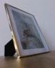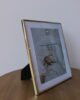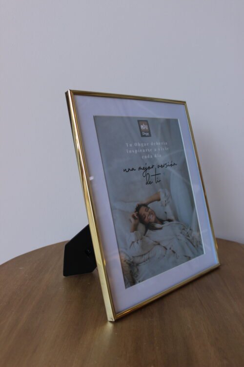Portarretrato decorativo con marco metálico en acabado dorado, de diseño limpio y elegante. Su estructura delgada realza la imagen o mensaje en su interior, aportando luz y sofisticación al espacio. Ideal para mesas, consolas, repisas o escritorios como acento decorativo y personal.
