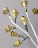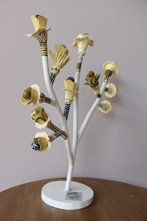 Figura decorativa con estructura en forma de rama y detalles orgánicos en tonos crema, dorado y acentos gráficos. Su diseño artístico y artesanal convierte cada pieza en un punto focal ideal para mesas, consolas o repisas, aportando personalidad y estilo contemporáneo al espacio.