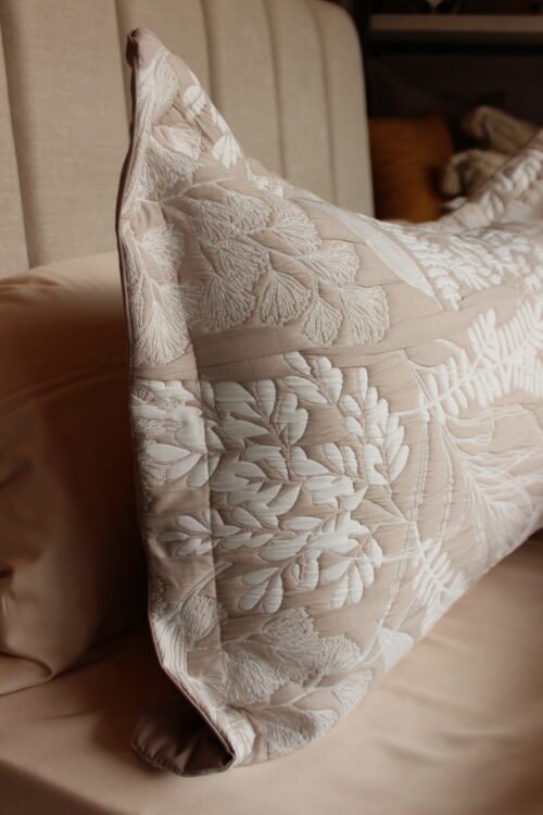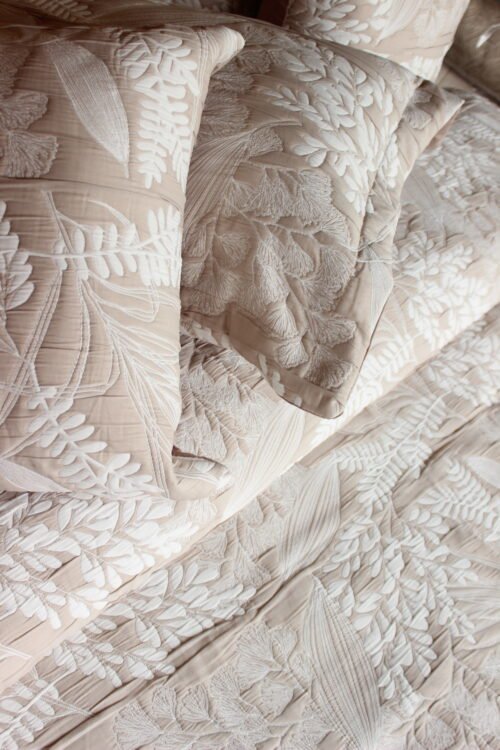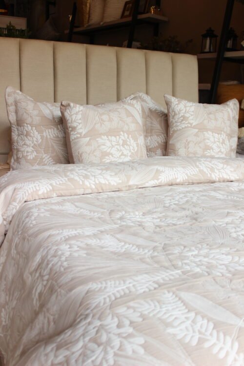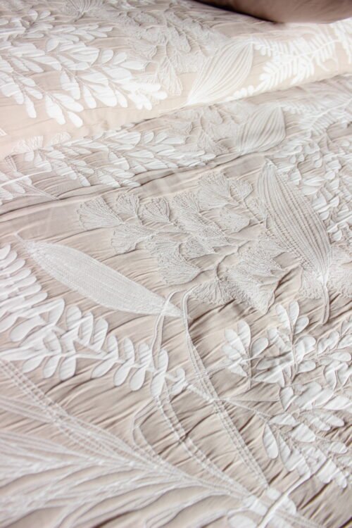 Sobrecama beige con diseño floral en relieve.Confeccionada en textil suave y ligero, esta sobrecama destaca por su delicado patrón botánico en tonos beige y blanco que aporta textura y profundidad sin perder sutileza. Su diseño floral en relieve crea un efecto visual elegante y atemporal, ideal para dormitorios serenos y sofisticados. La combinación de tonos neutros permite integrarla fácilmente en espacios cálidos, contemporáneos o de estilo natural–orgánico.Una pieza que transforma la cama en un refugio acogedor y armonioso.