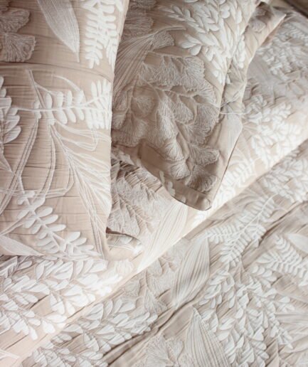 Sobrecama beige con diseño botánico. Confeccionada en textil suave y ligero, esta sobrecama presenta un delicado estampado de hojas en tonos beige sobre fondo claro, creando un efecto cálido y armonioso. Su diseño natural aporta movimiento y sofisticación al dormitorio sin perder sutileza. Ideal para espacios de estilo orgánico, contemporáneo o neutro, donde la textura y el patrón se convierten en protagonistas sin saturar el ambiente. Una pieza atemporal que transforma la cama en un punto focal elegante y acogedor.