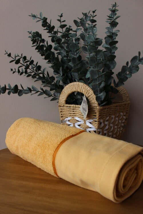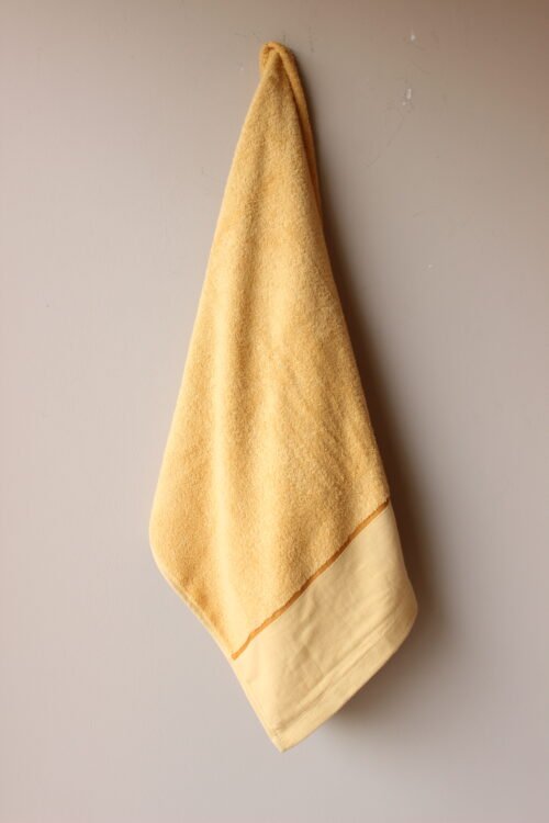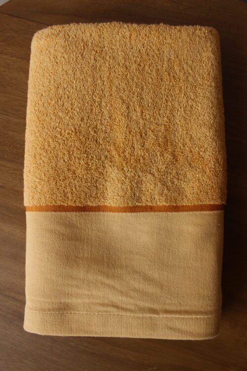 Toalla de cuerpo elaborada en algodón de alta absorción, en un tono mostaza suave que aporta calidez y un aire natural al baño. Su diseño combina una superficie esponjosa con una franja lisa en lino, creando un balance elegante entre textura y sobriedad. Ideal para baños contemporáneos, estilos mediterráneos o espacios tipo spa que buscan luz, confort y personalidad.