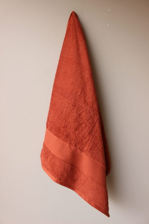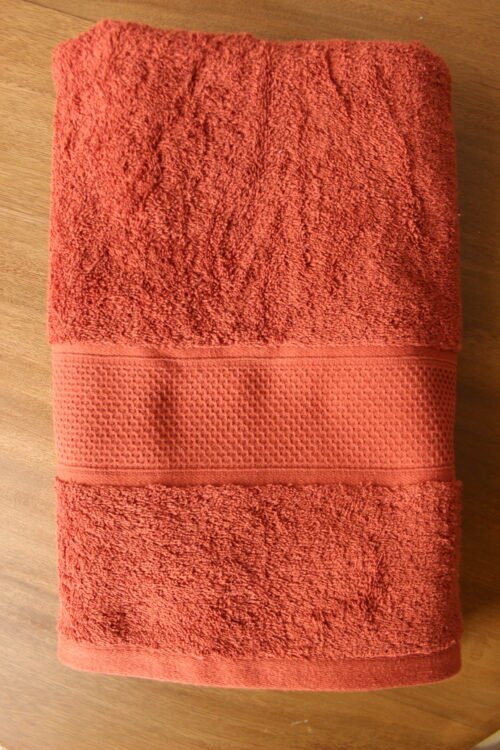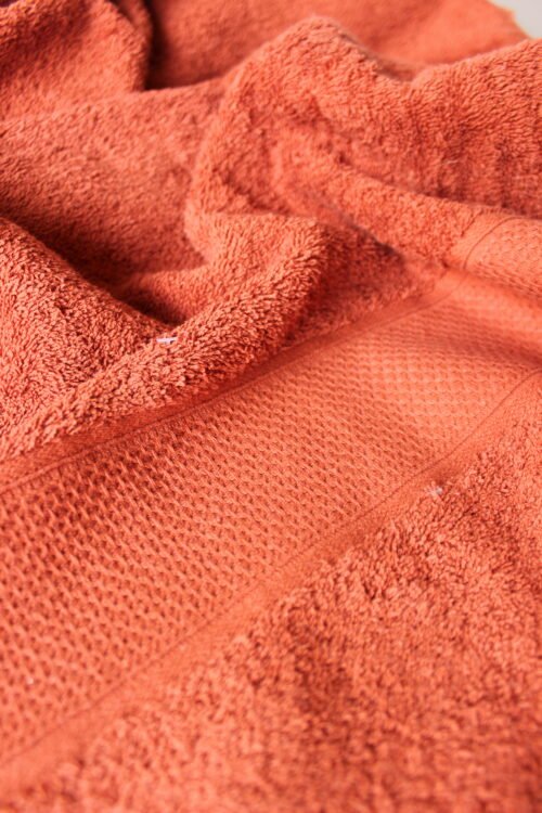 Toalla de cuerpo elaborada en algodón de alta absorción, en un tono terracota profundo que aporta calidez y carácter al baño. Su textura esponjosa brinda una sensación envolvente y confortable, mientras que la franja central tipo waffle añade un detalle contemporáneo y decorativo. Ideal para baños modernos, estilos naturales o espacios tipo spa que buscan un toque sofisticado y acogedor.