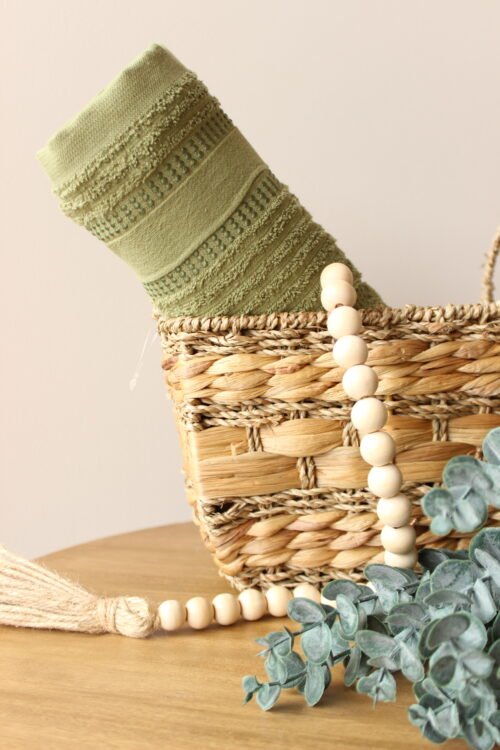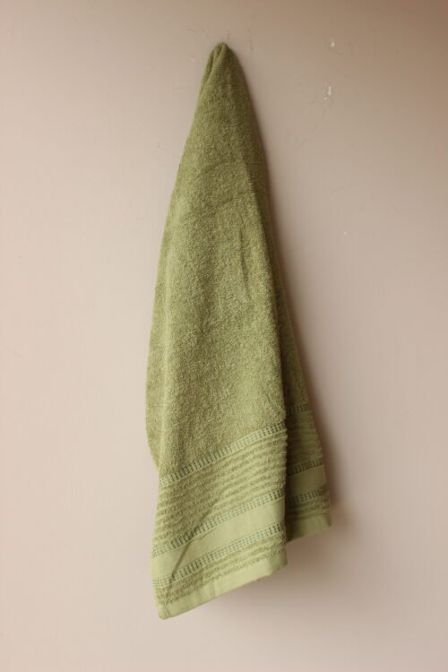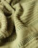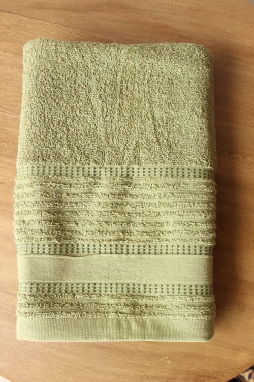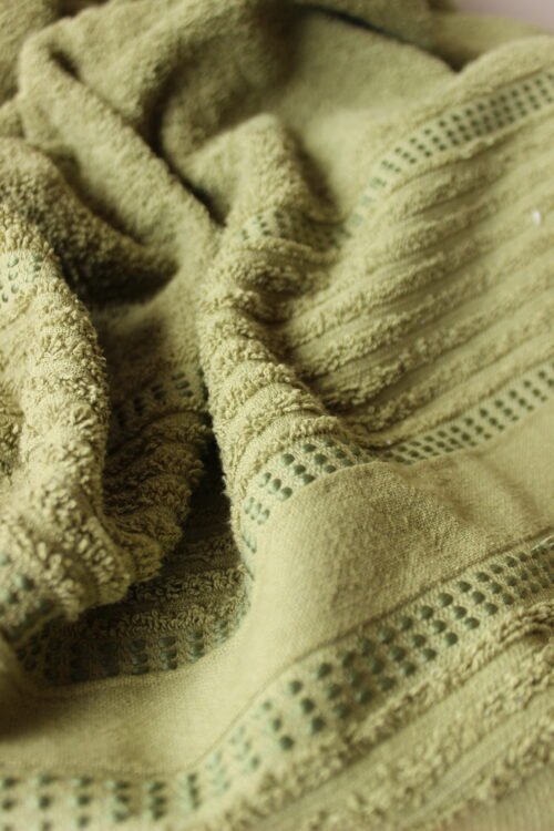 Toalla de cuerpo elaborada en algodón de alta absorción, en un tono verde salvia suave que transmite calma y conexión con lo natural. Su diseño combina una textura esponjosa con una franja central decorativa de relieves sutiles, aportando profundidad y un acabado sofisticado. Ideal para baños serenos, estilos spa o espacios que buscan una estética fresca, natural y elegante.